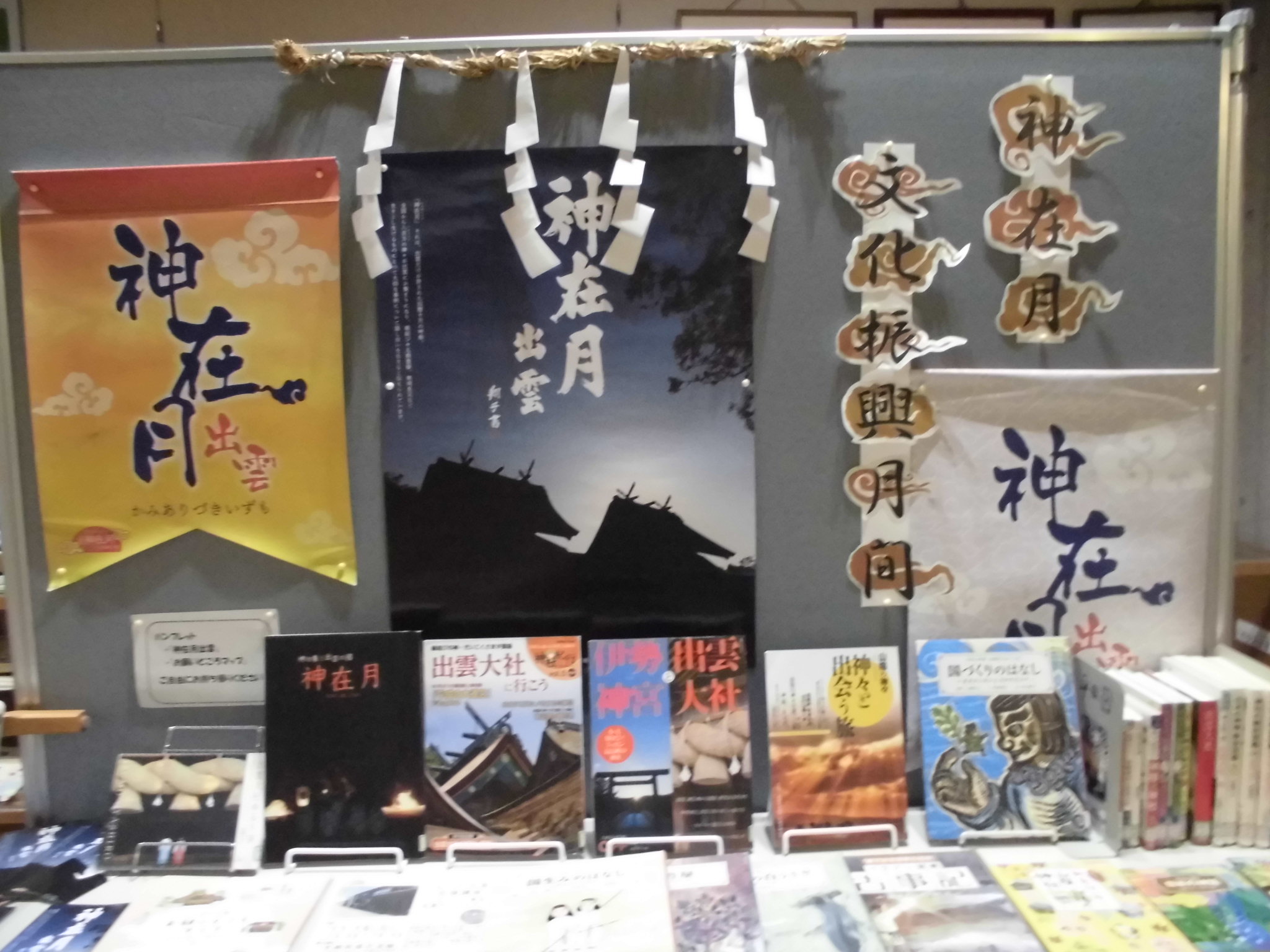 2025年10月9日 / 最終更新日 : 2025年10月9日 全館行事・イベント 出雲「神在月」文化振興月間タイアップ展示 出雲市では、毎年10月・11月を「神在月文化振興月間」と定め、「神在月」を全国に情報発信しています。 市内各図書館においても、関連図書を展示しています。展示本は貸出しできますので、ぜひご利用ください。 【10月】出雲中央図書館、平田図書館、佐田図書館、海辺の多伎図書館、大社図書館 【11月】湖陵図書館、ひかわ図書館 タイアップ展示(平田図書館)
